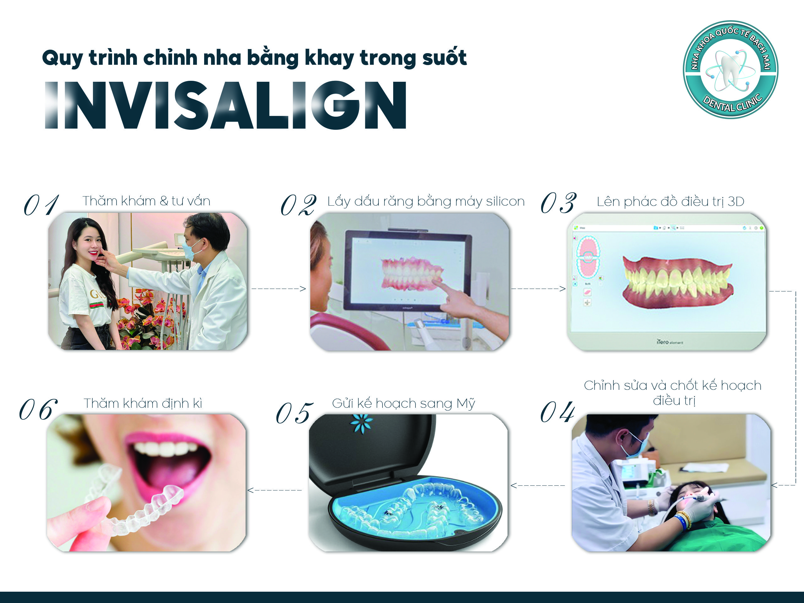 Bước 5: Bác sĩ chỉnh nha gửi kế hoạch điều trị cho các kỹ thuật viên sản xuất bộ khay tại nhà máy ở Mỹ. Khoảng 2,3 tuần khay được chuyển về Việt Nam. Bác sĩ giao khay cho khách hàng. Mỗi cặp khay khách hàng sẽ đeo khoảng 1 đến 2 tuần, sau đó chuyển sang cặp khay kế tiếp, trong suốt quá trình điều trị bác sĩ sẽ kiểm soát các vấn đề phát sinh và thực hiện một số căn chỉnh tùy theo từng trường hợp.